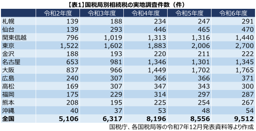 上記発表資料などから、直近5年分の相続税の実地調査件数を局別にまとめると、表1のとおりです。