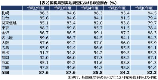 次に、調査件数に占める申告漏れ等の非違があった件数の割合(以下、非違割合)をまとめると、表2のとおりです。